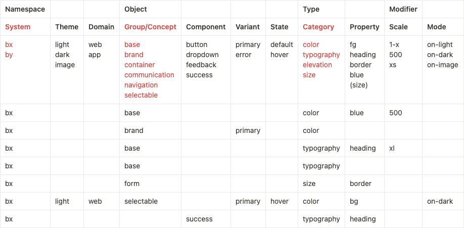 bx-light-button-color-bg-primary-hover), some more hierarchically “correct” (bx-light-button-primary-bg-color-hover) and some will make your notation and variety slimmer than others. Also some orders make more or less sens for option, semantic and component tokens. Play around a bit and use the one that feels best for you.